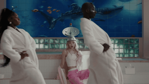 a woman in pink pants is sitting in a bathtub while a man in a white robe stands behind her