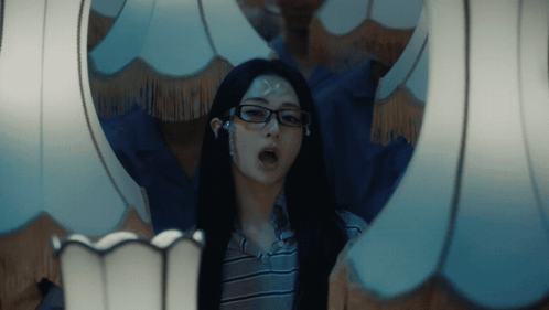a woman wearing glasses and ear buds is surrounded by white lamps