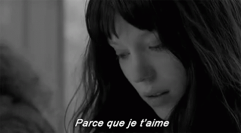 Léa Seydoux in a black and white scene, expressing 'Parce que je t'aime' (Because I love you).