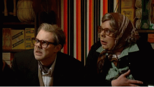 Tubs and another character from League Of Gentlemen in their local shop, looking intently at something off-screen.