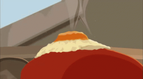 Voltar from League of Super Evil comically cooks Doomageddon over a steaming hot surface, wielding a spatula.