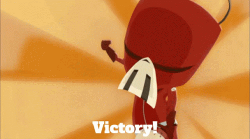 Voltar, the animated character from League Of Super Evil, raises a fist in triumph, exclaiming 'Victory!'