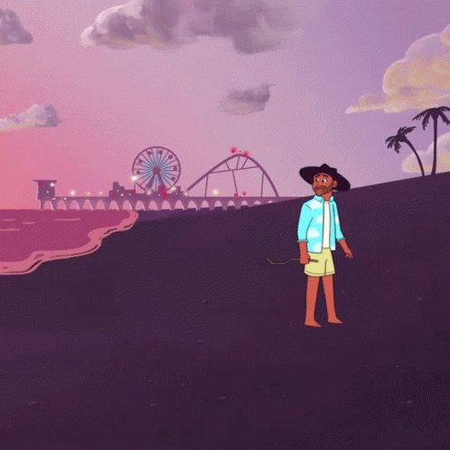 A man walks barefoot on a beach at sunset, leaving Parson James behind, with a pier and amusement park in the background.