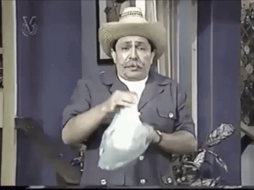 A man in a straw hat and mustache, holding a clear bag, speaks animatedly in what appears to be an old TV show.