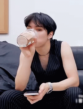 Lee Minhyuk Huta sips milk tea while sitting on a couch, holding a phone.