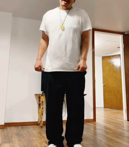 Doggface208 shows off his groovy leg dance moves in a hallway, feeling the music.