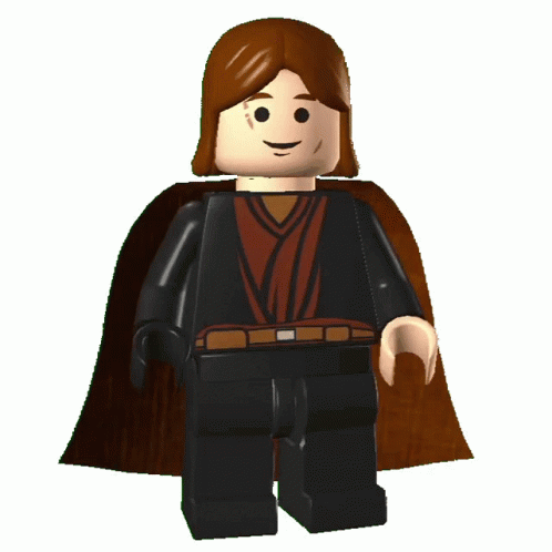 Lego Anakin Skywalker from Star Wars, wearing a cape, smiles and waves.