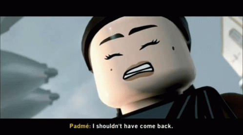 Lego Star Wars: Padmé Amidala expresses regret, saying 'I shouldn't have come back' in a game scene.