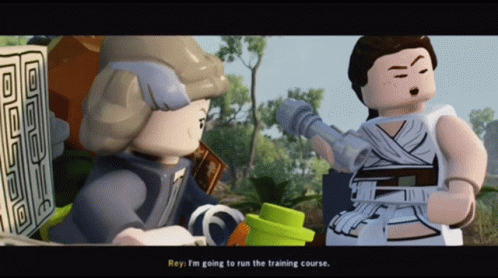 Lego Star Wars character Rey announces she's going to run the training course.