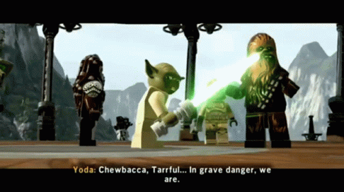 Yoda warns Chewbacca and Tarrful of grave danger in a scene from the Lego Star Wars video game.