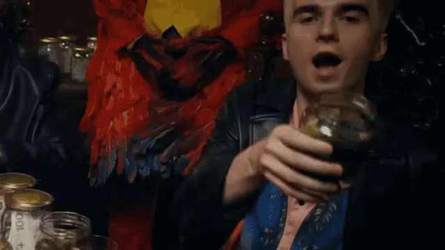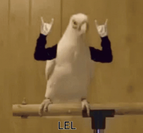 A white bird with human arms makes a devil horns gesture while sitting on a branch, with 'LEL' caption.