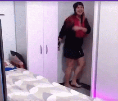 Lelabuffo, the streamer, dances joyfully in her room, wearing a black outfit and a red scarf.