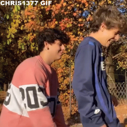 Lele Giaccari and Tancredi share a laugh while sitting together outdoors amidst autumn foliage.