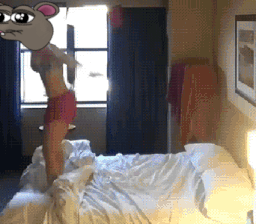 Lemmiwinks, the cartoon mouse, stands on a bed, then falls back onto the pillows.