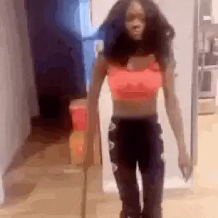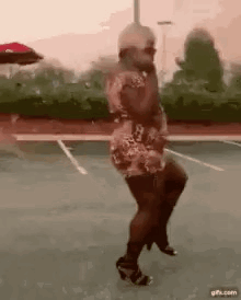 Leobylaw dancing energetically in a patterned dress and high heels on a parking lot.