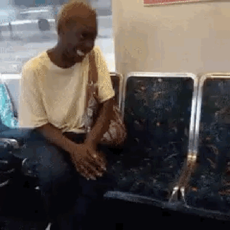 Leobylaw sitting on a public transport train, looking around and reacting to something off-camera.