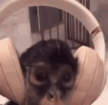 Leobylaw's monkey wearing large headphones, looking directly at the camera.
