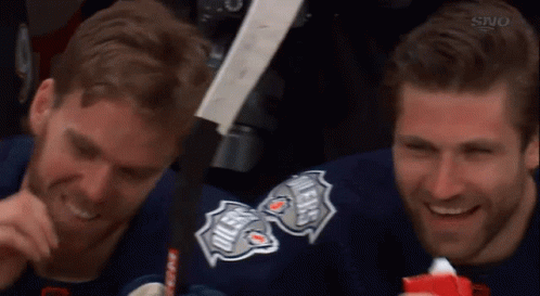 Hockey player Leon Draisaitl drinks from a red Biosteel pouch, wearing his Edmonton Oilers jersey.