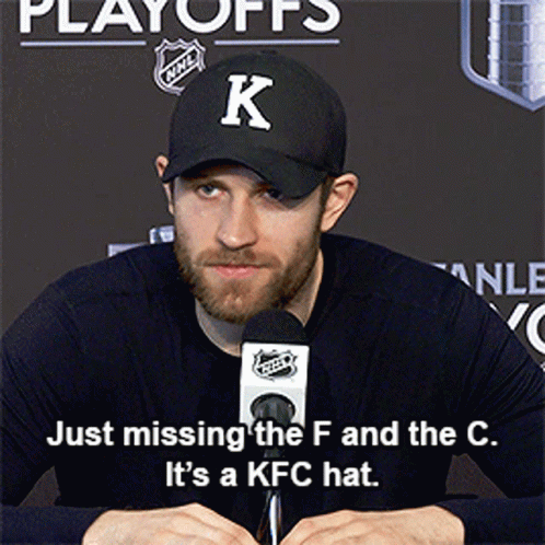 Leon Draisaitl, wearing a hat with a 'K', jokes about it being a KFC hat, just missing the 'F' and 'C'.