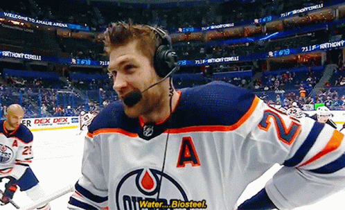 Leon Draisaitl, an Edmonton Oilers hockey player, talks about water and Biosteel during a game.
