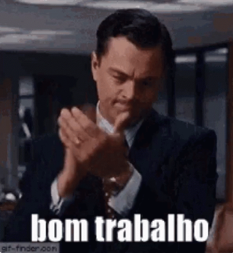 Leonardo DiCaprio clapping his hands, dressed in a suit, with 'bom trabalho' text overlaid.
