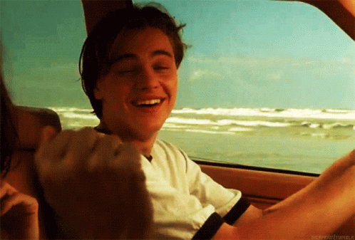 Young Leonardo DiCaprio laughing and smiling while driving a car by the ocean.