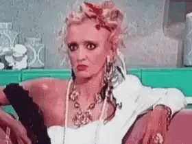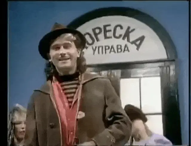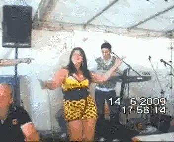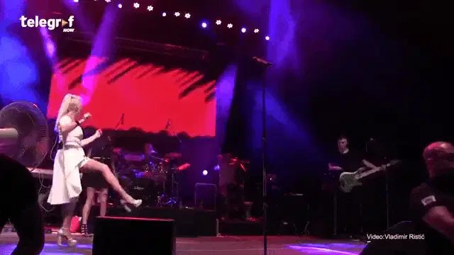 Lepa Brena energetically dancing in a light blue outfit, with the caption 'Ej Žali Žali Bože'.