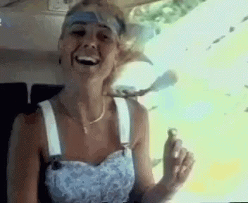 Lepa Brena laughing joyfully with a blue headband, wearing a light-colored top with suspenders.