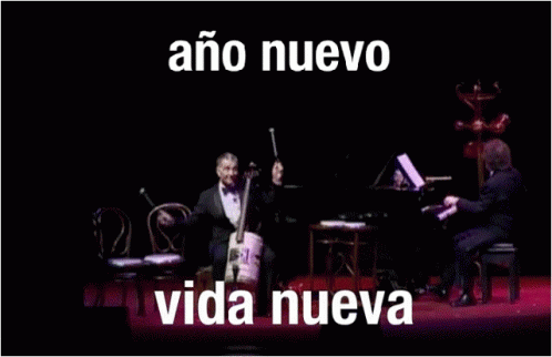 Les Luthiers perform a musical piece, celebrating 'New Year, New Life' with piano and cello on stage.