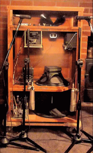A Leslie speaker cabinet with a large speaker cone, surrounded by microphones for audio recording.