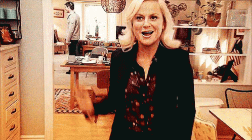Leslie Knope from Parks and Recreation performs an excited, celebratory dance.