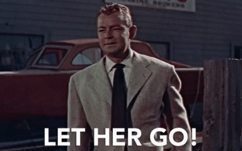 A man in a suit and tie sternly demands 'Let her go!' in front of a vintage car.