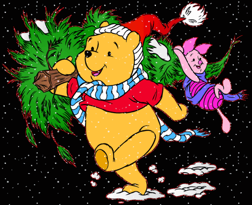 Winnie the Pooh and Piglet joyfully carry a Christmas tree through a snowy landscape for the holidays.