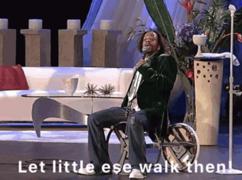 Katt Williams performs on stage in a wheelchair, holding a microphone and saying 'Let little ese walk then!'