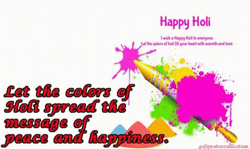 A vibrant Happy Holi greeting card wishing peace and happiness, featuring colorful paint splatters and a pichkari.