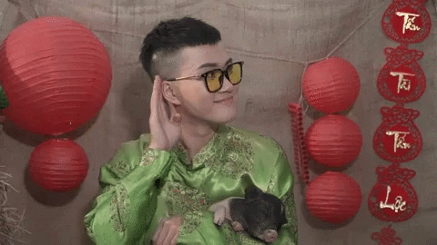 Lethienhieu, wearing sunglasses and a green outfit, celebrates Tet 2019 with a cute piglet.