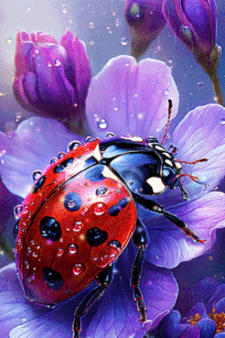 A vibrant red ladybug rests on a purple flower petal, covered in sparkling water drops.