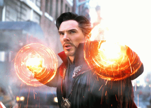 Benedict Cumberbatch as Dr. Strange, intensely casting a powerful spell with glowing orange energy circles in his hands.