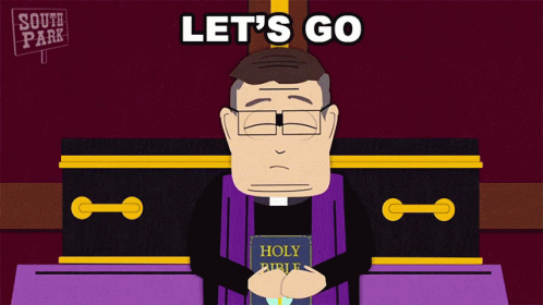 Father Maxi from South Park enthusiastically exclaims 'Let's Go' while holding a Holy Bible.