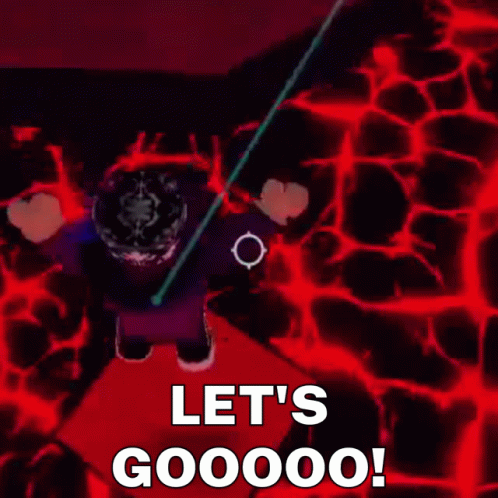 Roblox character Trelakor stands on a red lava floor, holding a sword and exclaiming 'LET'S GOOOOO!'