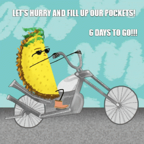 An animated taco character on a motorcycle with a countdown: '6 Days To Go!'