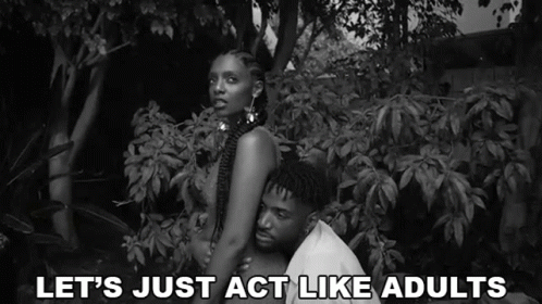 Mereba with a man in a black and white scene, featuring the caption 'Let's Just Act Like Adults'.