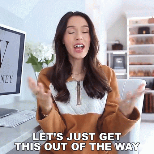 Shea Whitney gestures with her hands while speaking the phrase, "Let's just get this out of the way."