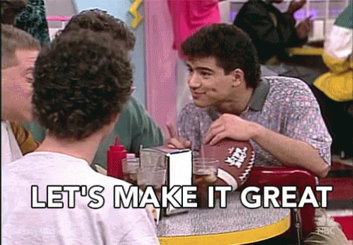 Mario Lopez, as AC Slater from Saved By The Bell, holds a football and says "Let's Make It Great" at a diner table.