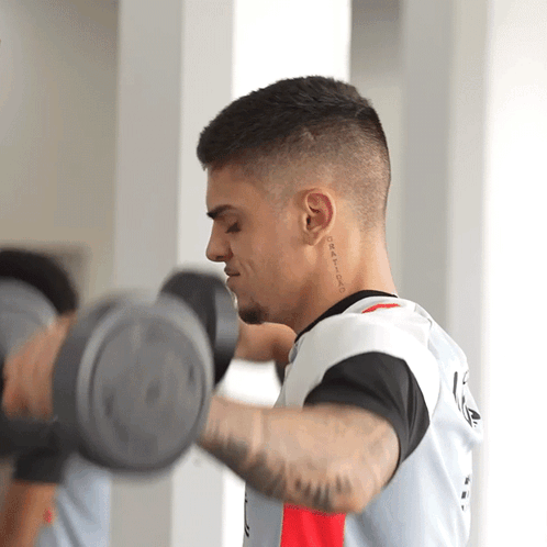 Gabriel Pec intensely lifts dumbbells during a gym workout, showcasing his strength and focus.