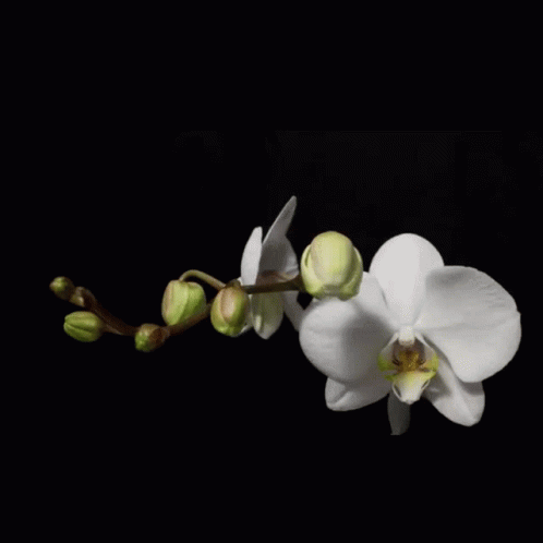 Lexi Alexis with elegant white orchids blooming against a dark background, buds slowly opening.