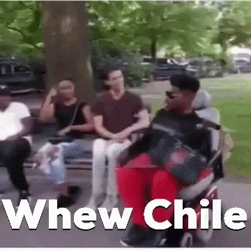 Rollingray reacts with a 'Whew Chile' expression while sitting on a bench outdoors.