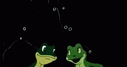 Two animated frogs from Soyuzmultfilm talking and blowing bubbles in a dark, atmospheric setting.