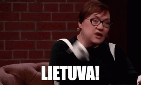 Ausra Maldeikiene passionately shouts 'Lietuva!' with her fist raised.
