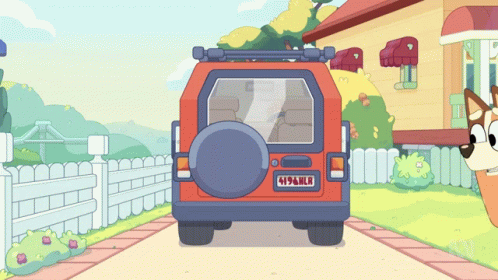 Bandit struggles to get into the car, then Chilli helps him in this scene from Bluey.